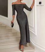 Elegant Bardot Neckline: The off‑shoulder, elasticized neckline sits securely across the upper arms, showcasing the collarbone and shoulders in true luxury fashion Sculpting Bodycon